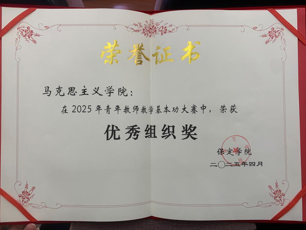 党委副书记、校长韩会玲宣读了《保定学院2025年青年教师教学基本功大赛获奖名单》。本次大赛共评选出78位获奖教师和6个优秀组织单位。其中,保定学院马克思主义学院教师杨田获大赛一等奖,赵新颖、刘楠获大赛二等奖,王继辉、张芃菲、刘媛婷获大赛三等奖。保定学院马克思主义学院获优秀组织奖。杨田等5位教师将代表学校参加保定市第十一届高校青年教师教学竞赛。