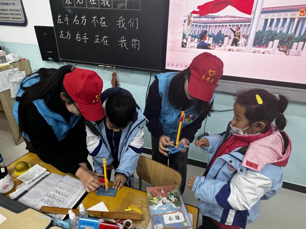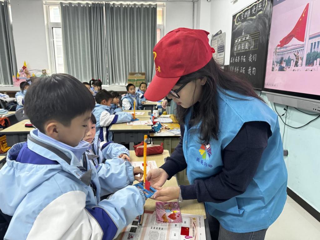 为了让学生能够更好分辨党旗、国旗、军旗、团旗、队旗等不同旗帜,志愿者们开展了“祖国旗帜我会贴”活动,让学生们动手制作国旗贴画,并在作业单上贴上相匹配的贴纸。随后志愿者们还带领学生们亲自操作迷你国旗升降台,让学生动手尝试升降,增强学生的动手能力和团队合作精神。